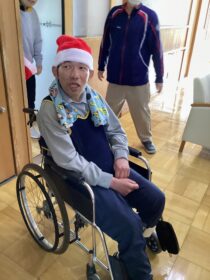 ↑利用者さんもサンタクロースの帽子を被ってもらいクリスマス気分を味わってもらいました。