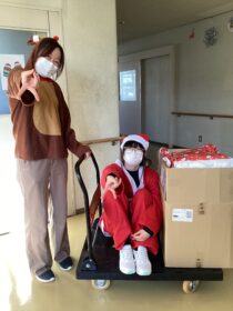 今年はソリに見立てた台車に乗ってプレゼントを届けました(笑)